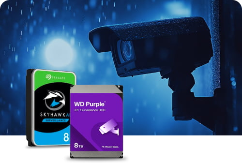 Specialized surveillance HDDs (WD Purple Pro/Seagate SkyHawk) with 24/7 reliability, 3x higher workload rating (550TB/year), and AI-optimized streaming for 64+ camera systems