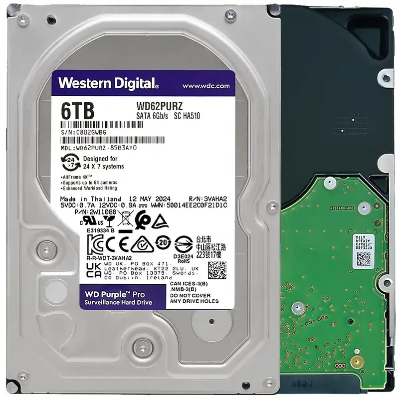 **WD Purple WD62PURZ 6TB HDD**: Optimized for 24/7 surveillance systems, this 3.5″ drive offers 6TB storage, 5640 RPM speed, and 128MB cache for smooth, high-capacity video recording. Features AllFrame 4K technology to minimize frame loss, support for up to 64 cameras, and enhanced error recovery for RAID reliability. Built for continuous operation, it ensures stable performance in write-heavy environments, with vibration resistance and a 3-year warranty. Ideal for demanding security setups requiring durable, high-volume storage.